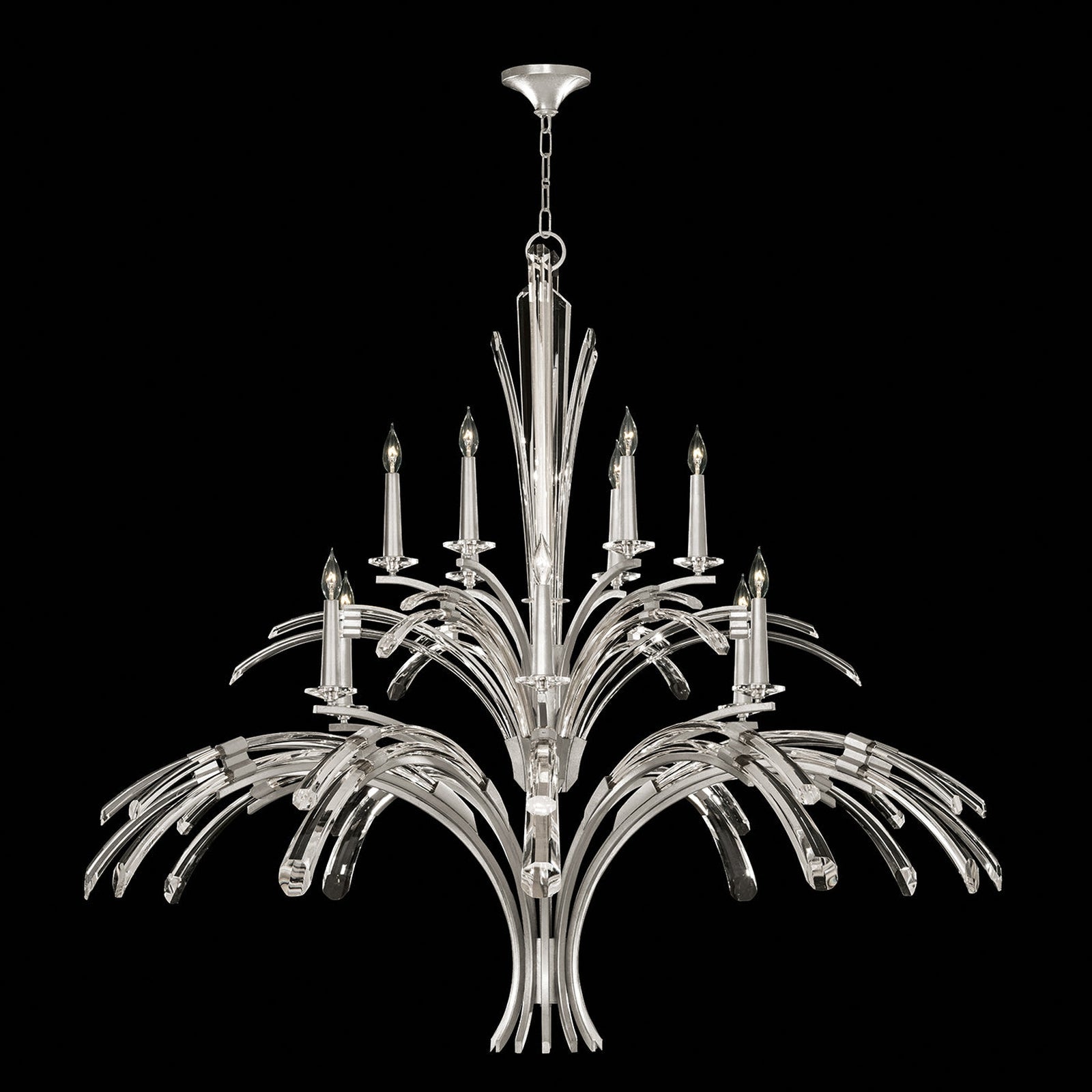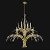 - Chandelier with gently curved hand carved crystals create fluid movement in profiles of grace and majesty.