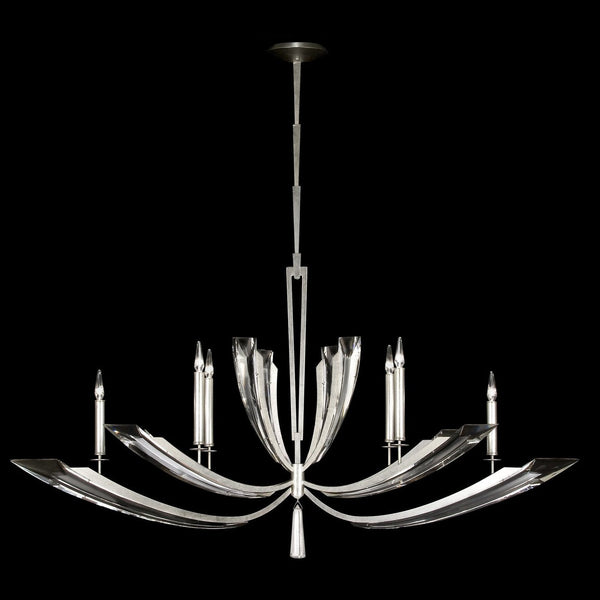 - Oblong chandelier featuring graceful sweeps of tapered beveled crystals precisely set in metal wings in an airy platinized silver leaf finish.