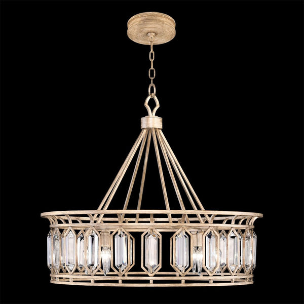 - Double-faced beveled crystals exquisitely float openly in individual metal frames.