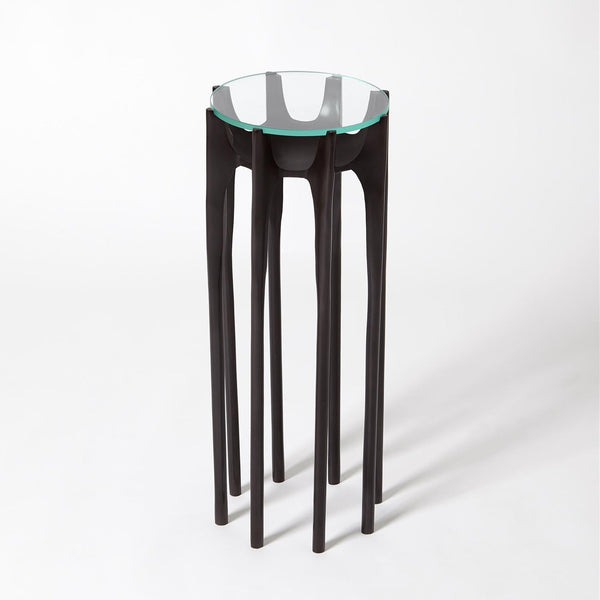 - Dramatic multi-legged martini table and cast in aluminum with a glass inset top.