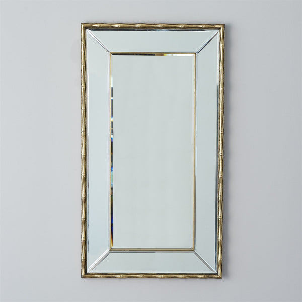 - With beveled mirror edges, the Bamboo Mirror is constructed of mango wood and covered in brass metal sheeting with antique brass finish.