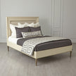 - With gentle sweeping curves, our Ellipse Bed is covered in black/ivory leather and brass plated steel/pewter metal finish with American white oak pie shaped veneer inserts creating a unique wood grain pattern.