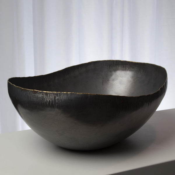 - Brutalist iron centerpiece bowl with braised brass accents on the edges.