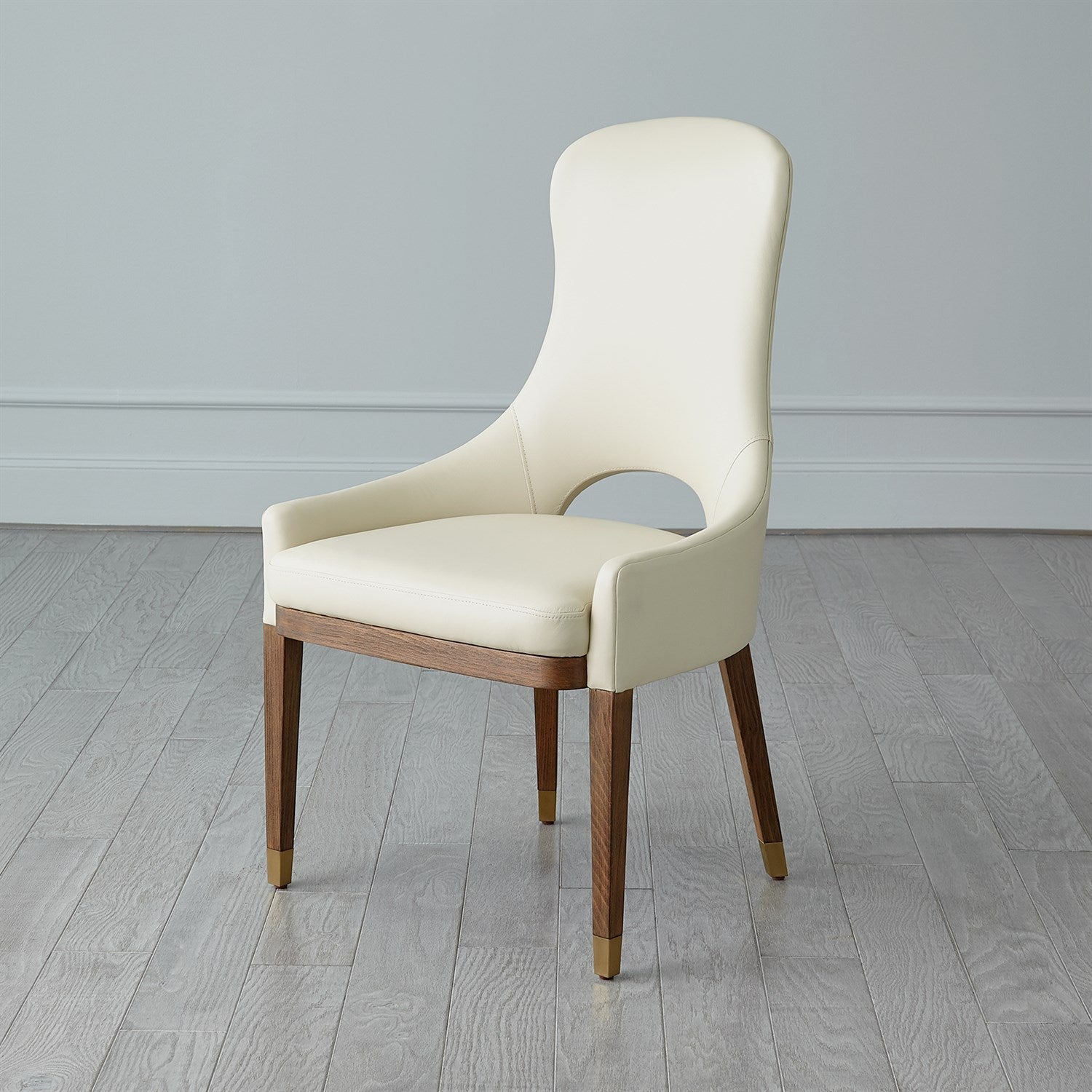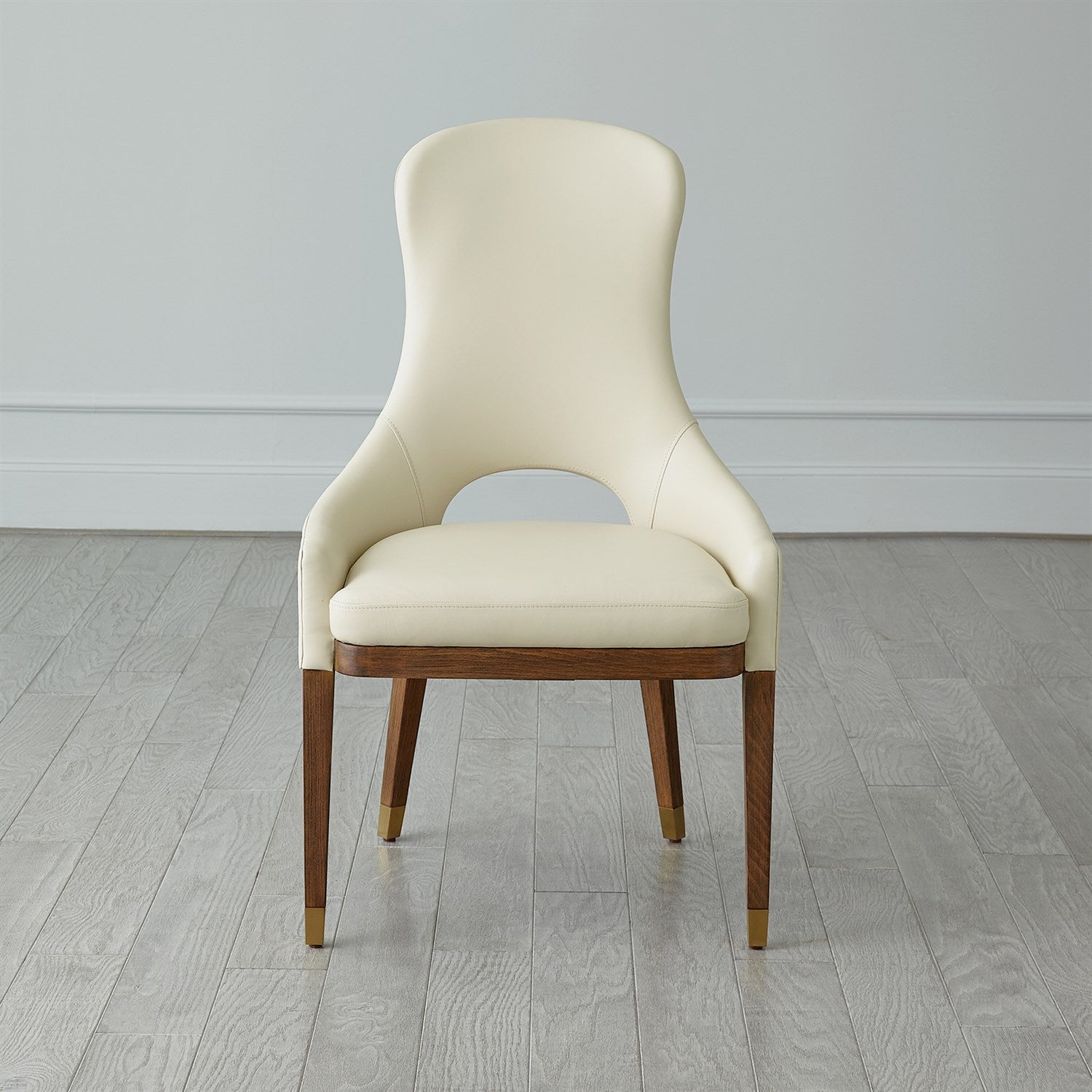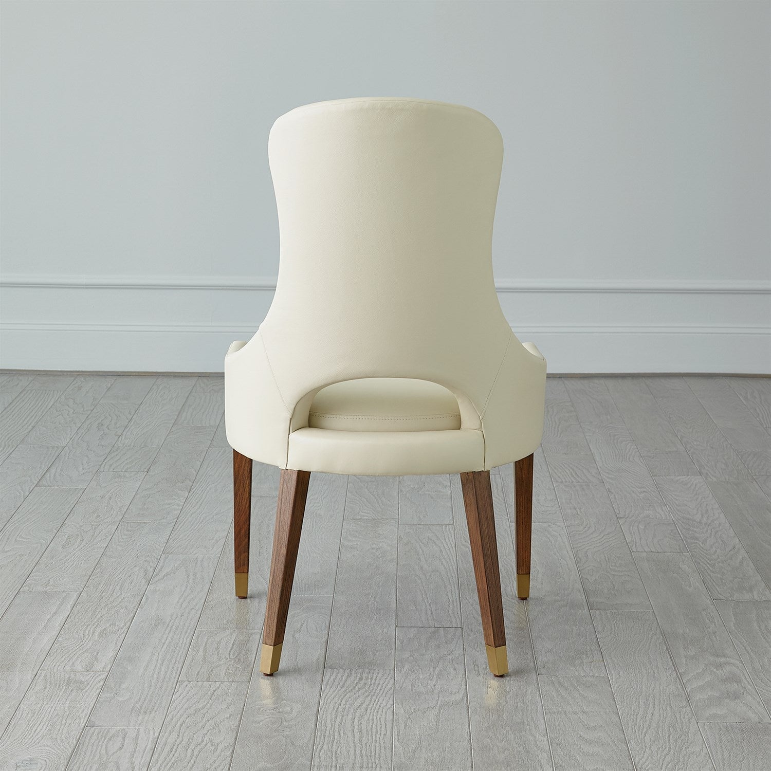 - The chair offers top grain ivory leather and a solid beech wood frame with a light oak finish and brushed brass feet.