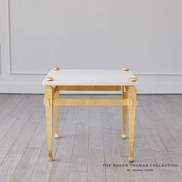 - The gold leaf versions pair with white marble tops and the nickel-plated versions feature flamed black marble.