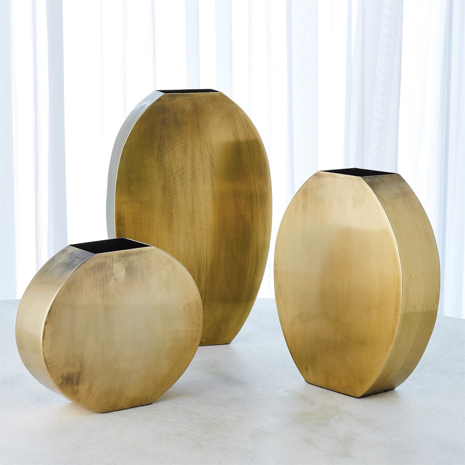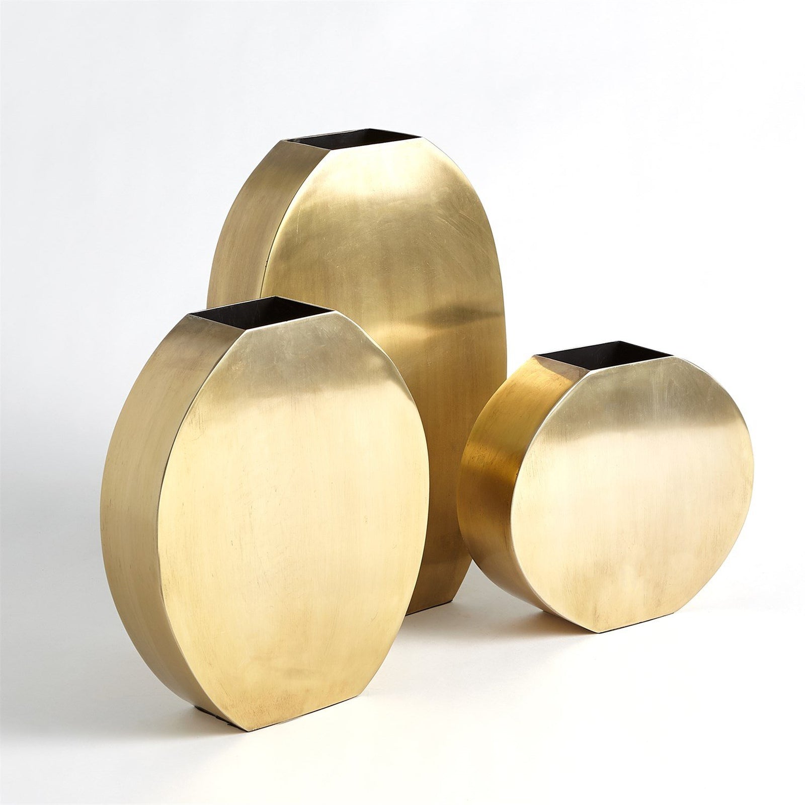 - Precisely formed sheets of stamped metal, the vase has square sides and an antique brass finish.