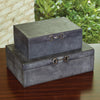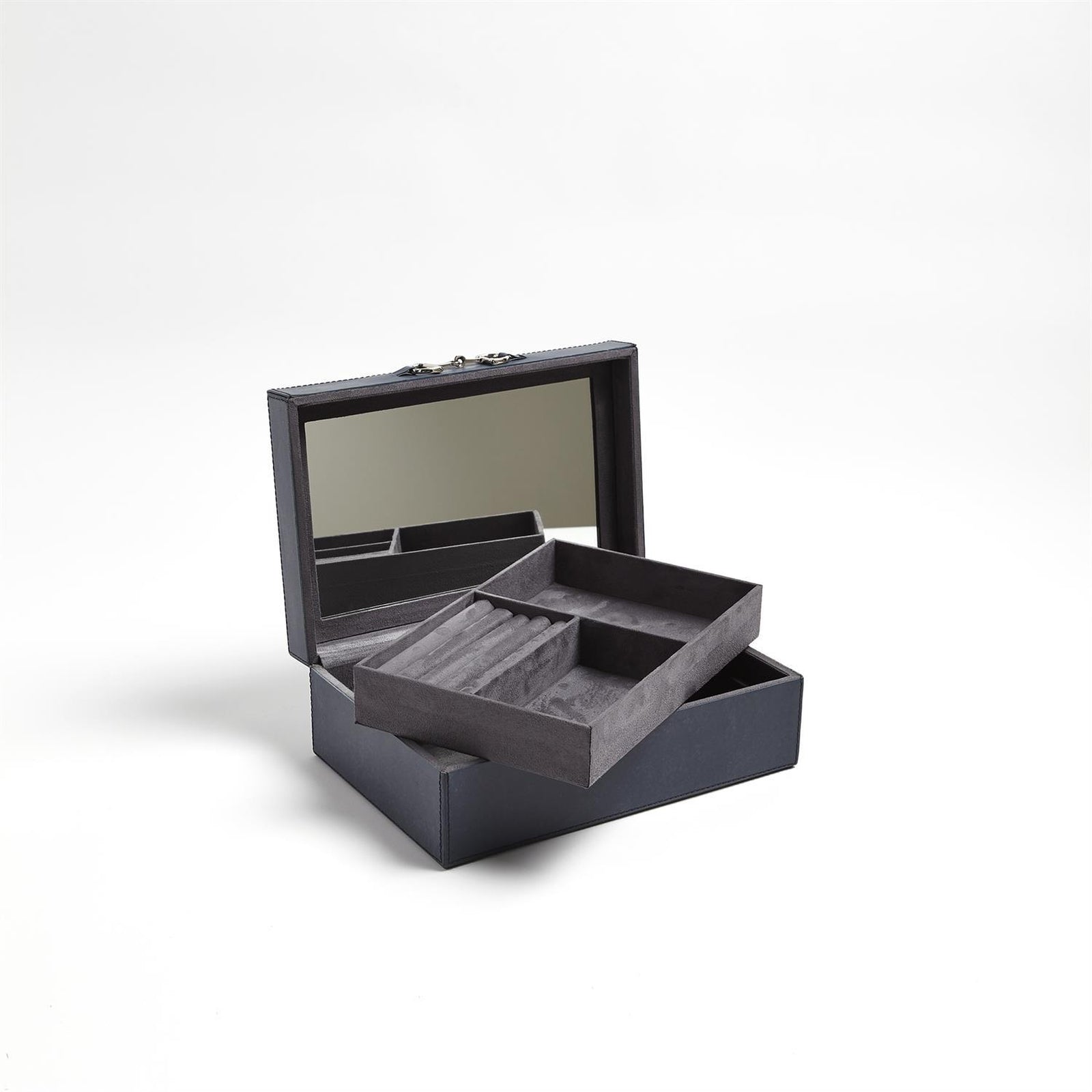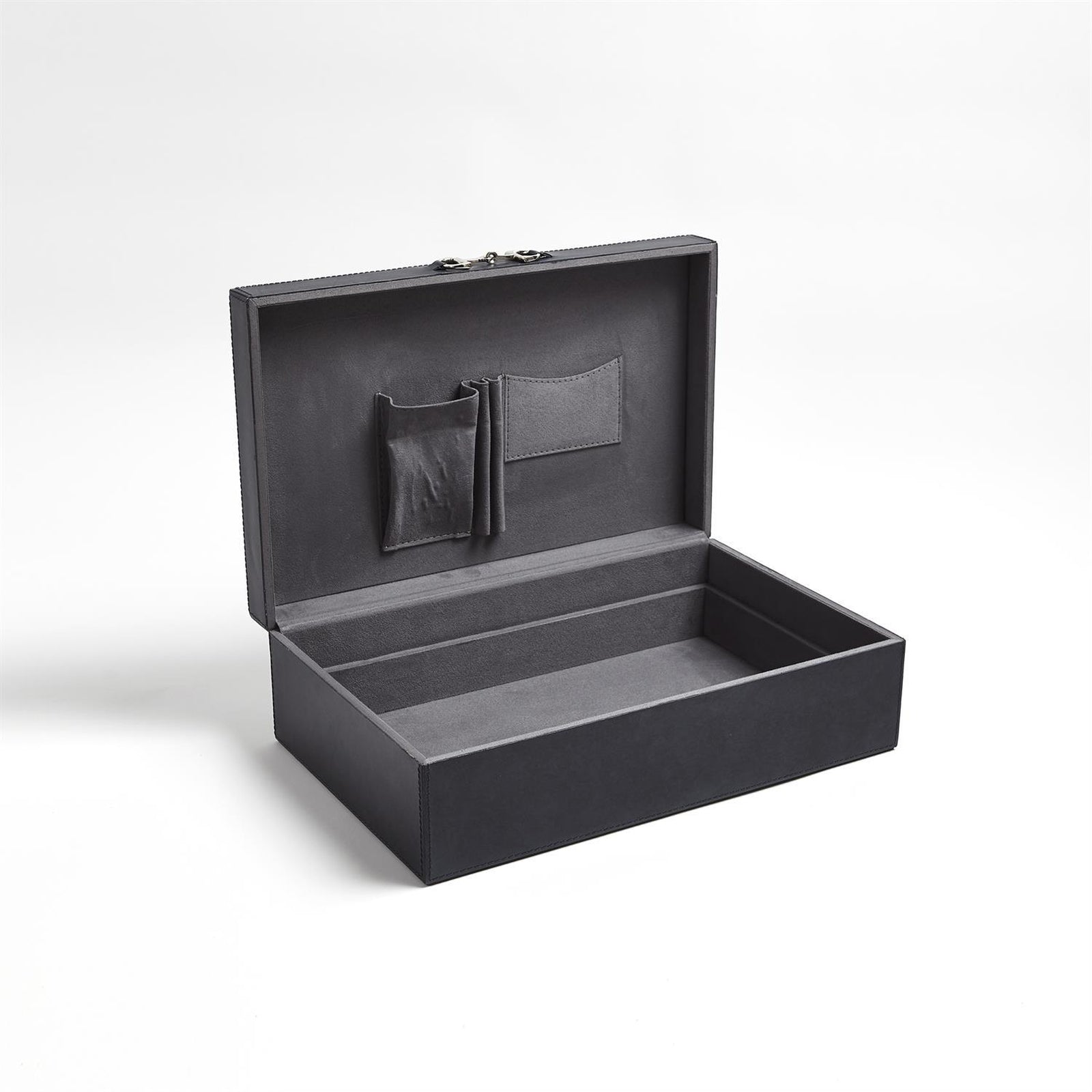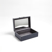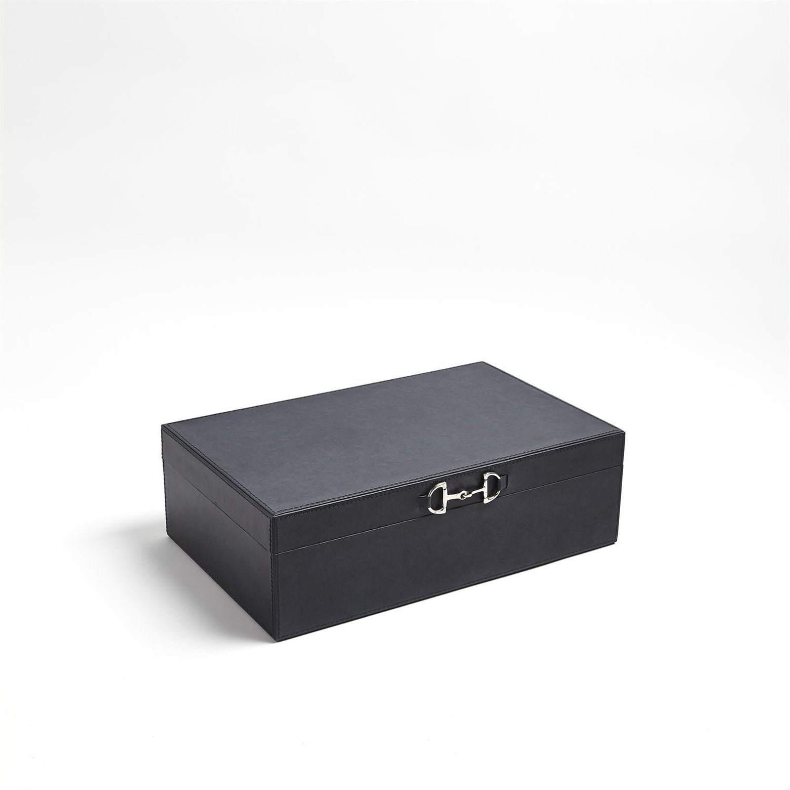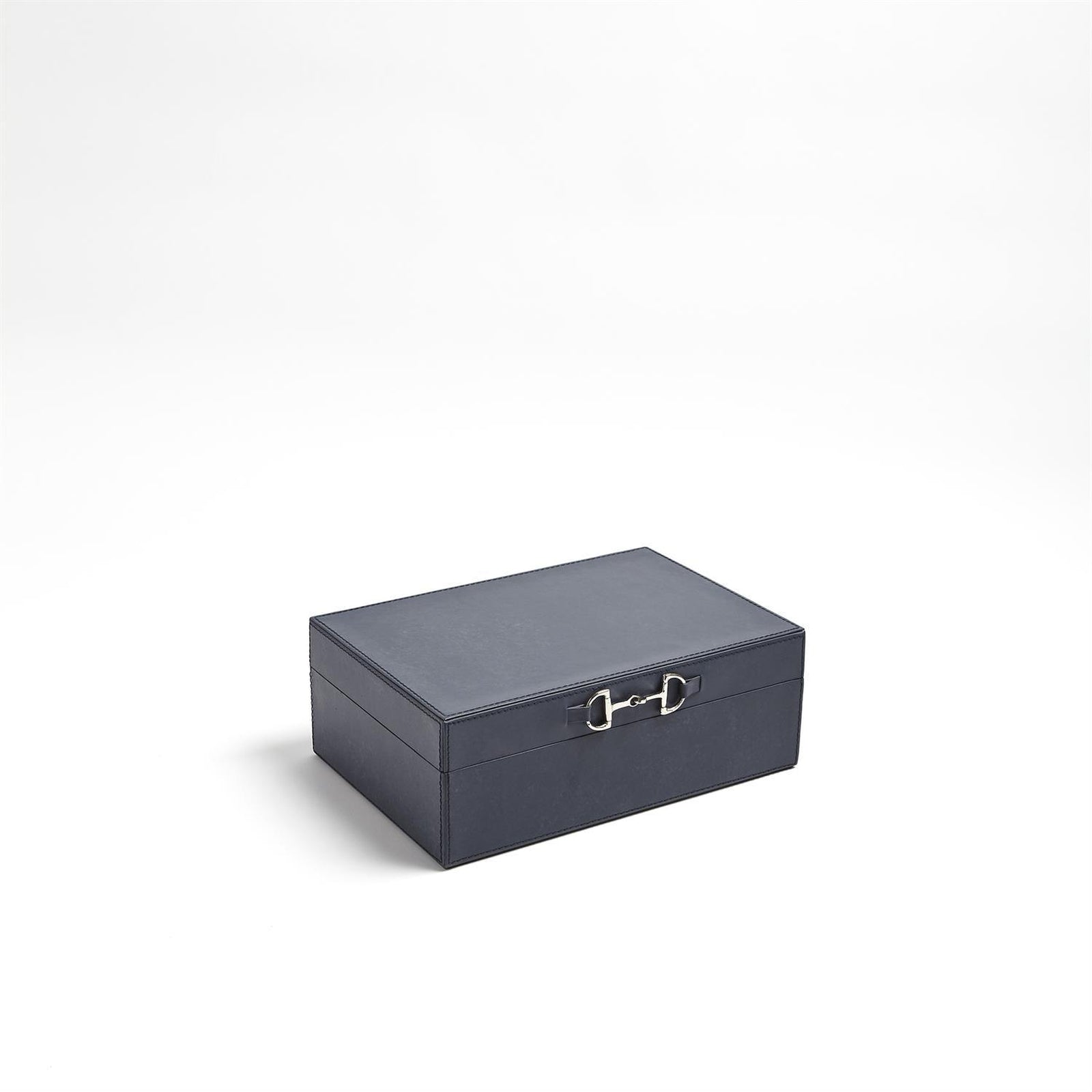- Stirrup Detail box is covered in hand stained washed blue leather and detailed with tonal bands and nickel horse bits.