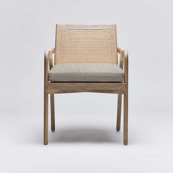 - White ceruse paired with off white caning lends the Delray Arm Chair an airy and inviting whiff of sophistication.