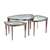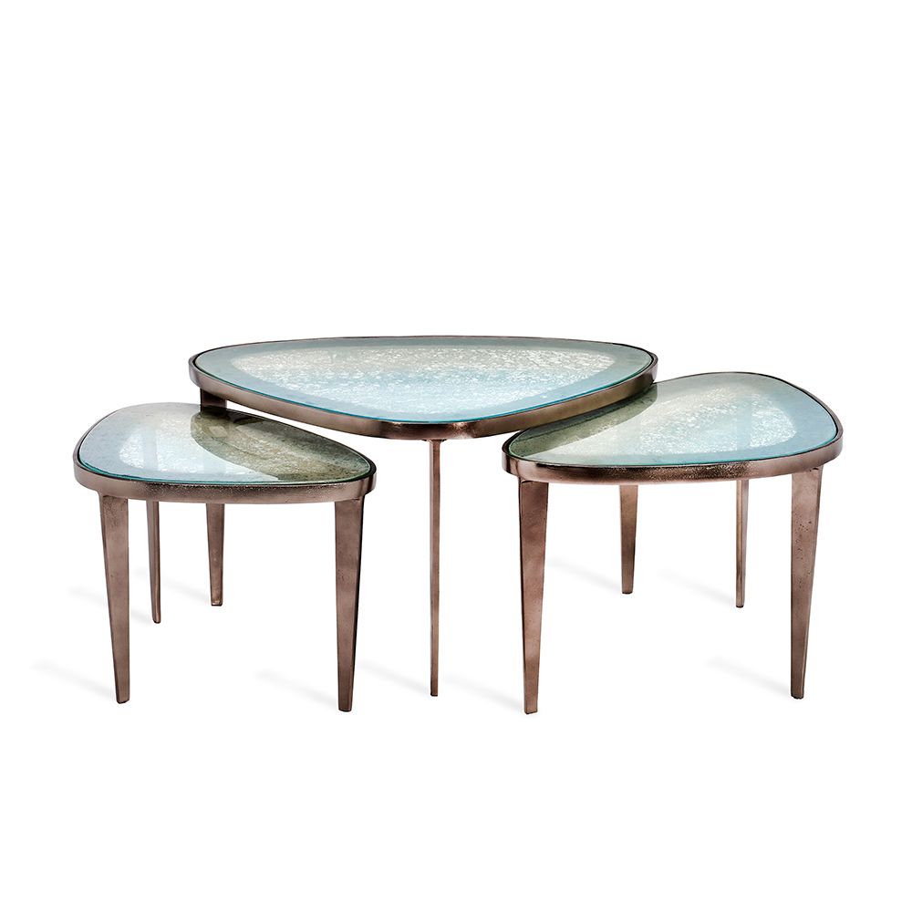 - Reactive grey sky / blue grey glass and an aluminum base in a champagne brass / antique nickel finish turn the eye-catching Jan Bunching Cocktail Tables into a dramatic trio.