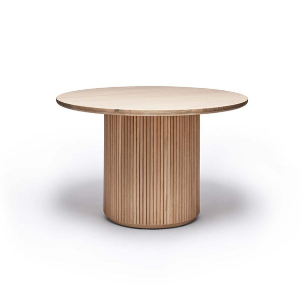- Crafted of mocha and pale natural finished oak and boasting a fabulous fluted base, the Laurel Round Dining Table is an organic statement piece.