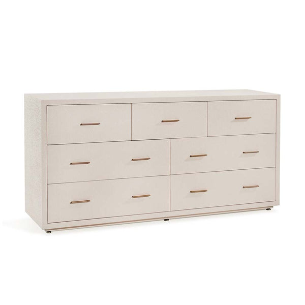 - The Livia 7 Drawer chest brings super-chic style thanks to its Caribbean sand faux linen texture and antique brass-finished hardware.