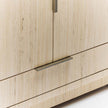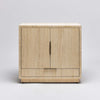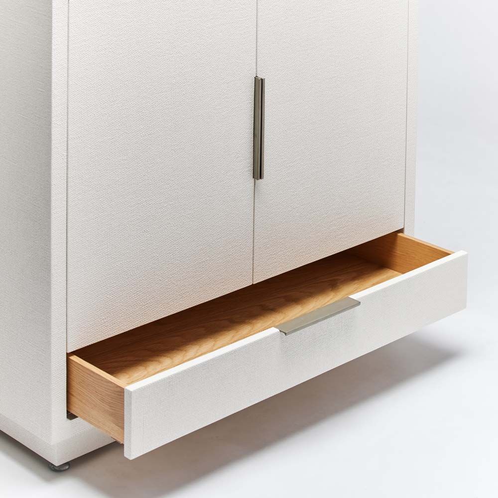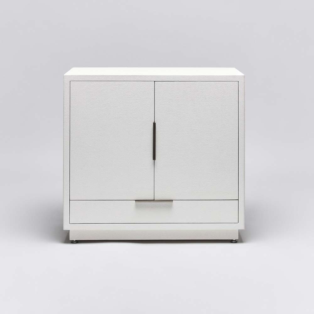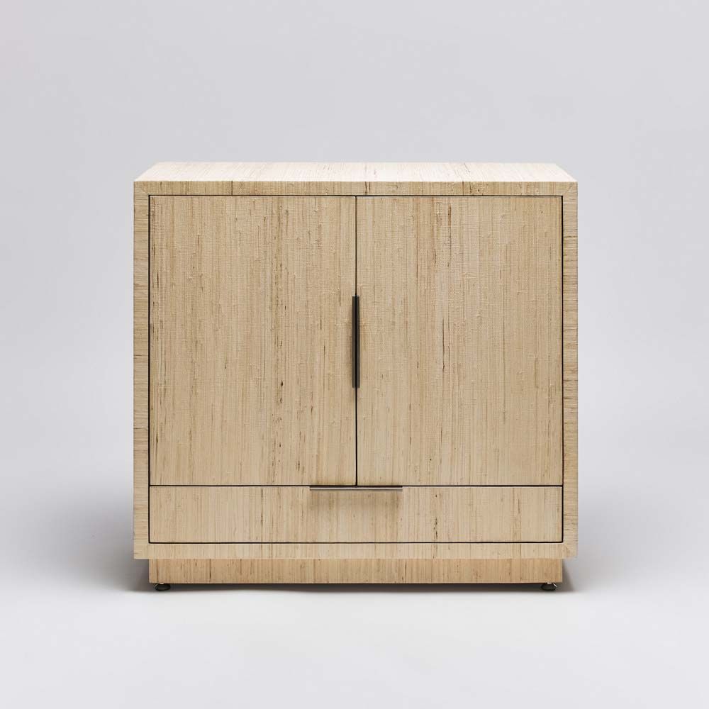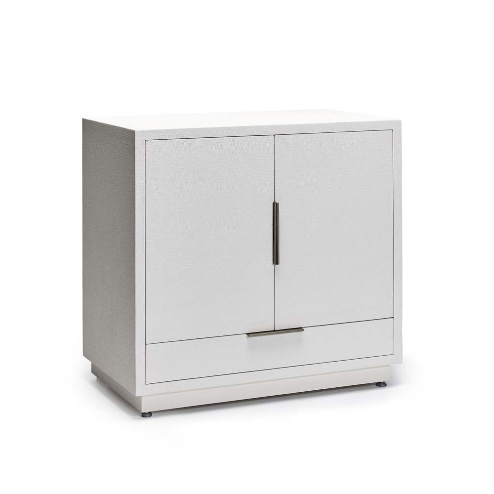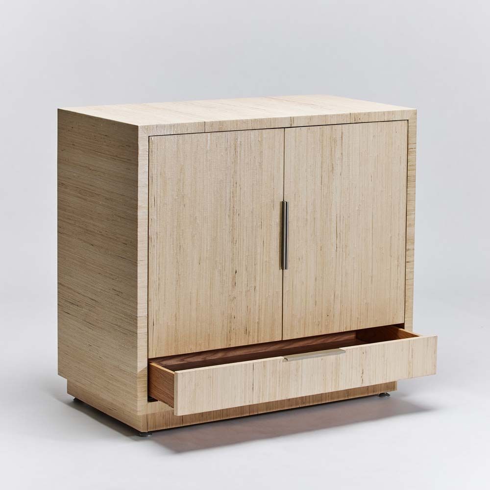- A fresh linen texture complements the sophistication of the Montaigne Bar Cabinet and its metal hardware.