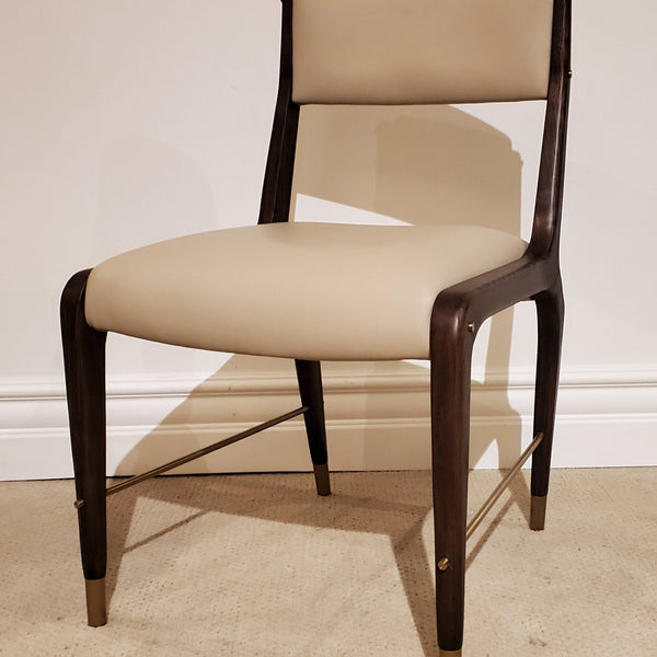 - Elegant and sophisticated, the grey and cream faux leather Tate Chair showcases a rich walnut-stained wood frame with metal details in a satin nickel finish.