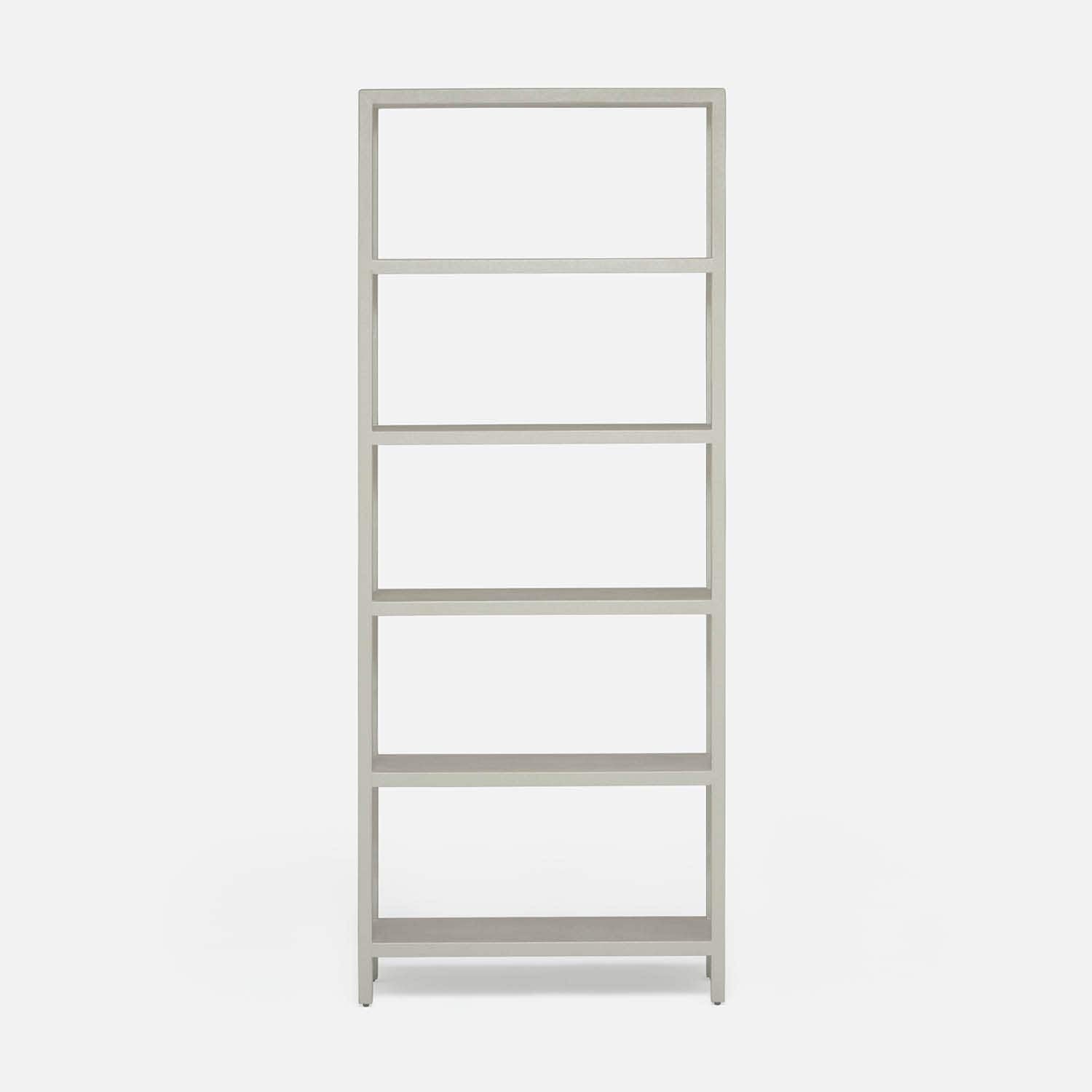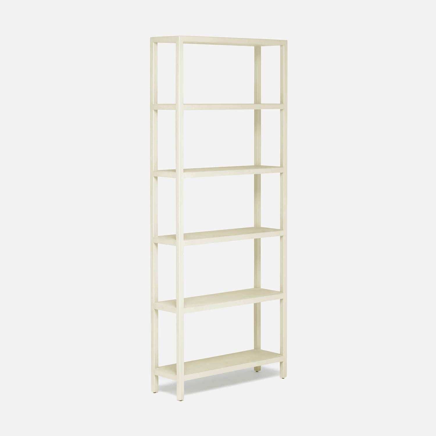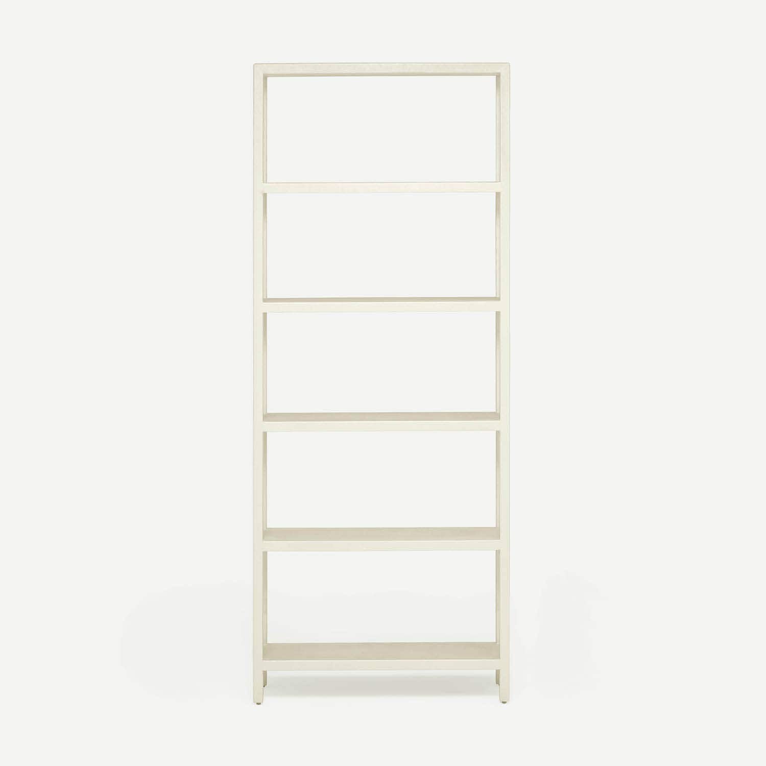 - Finished entirely in faux Belgian linen, the look is clean and modern with a natural texture that gives this piece an overall warmth-must-have shelving for living rooms, dining rooms, guest rooms, and more.