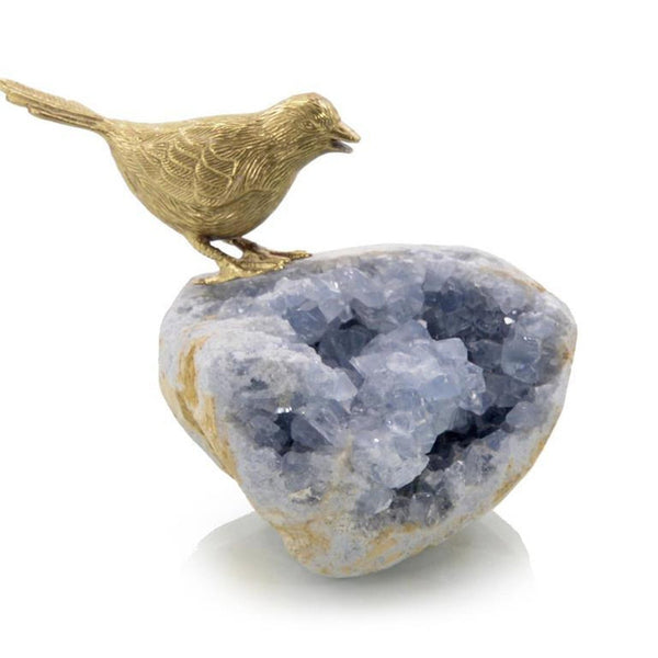- A hand-cast brass bird is perched on a light blue natural celestite geode, creating a wonderful natural accent for the home.