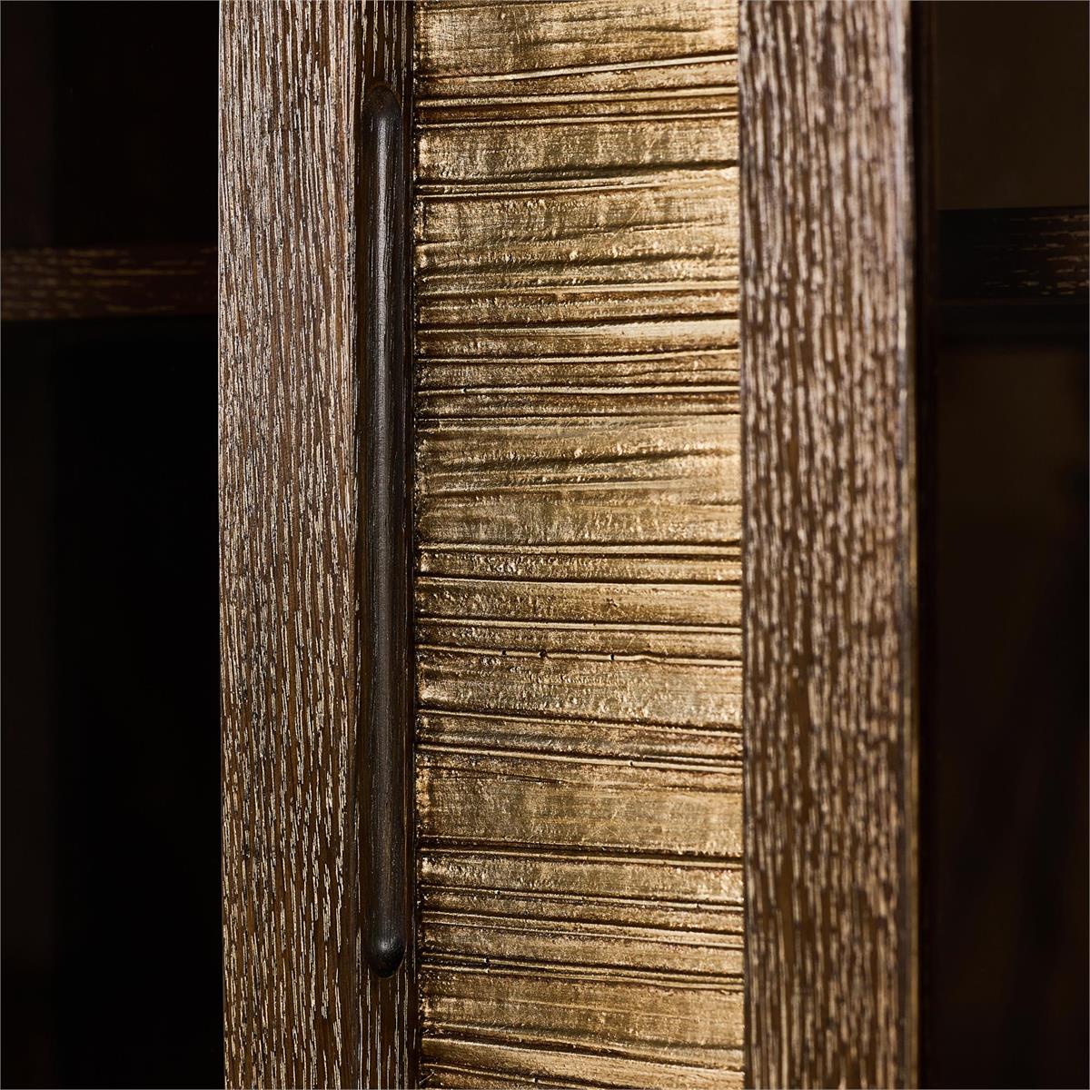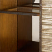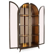- The piece features three fixed tempered glass shelves displayed behind two panes of bronze glass, matched by a bronze mirror in the rear of the interior