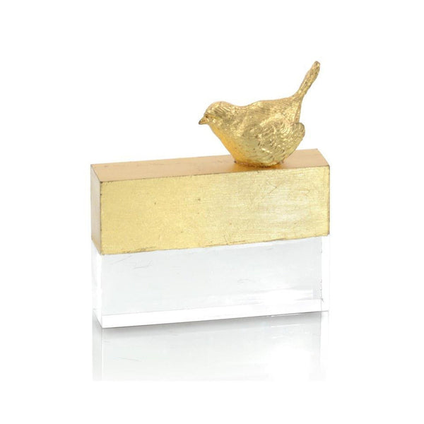 - A petite chickadee is perched on a clear acrylic block glazed with gold leaf.