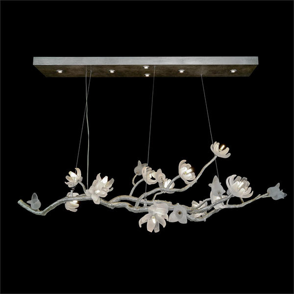 - This oblong chandelier has branches in antique silver leaf with thirteen frosted mouthblown glass magnolia lights and ten decorative frosted mouthblown glass tulips.