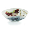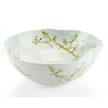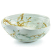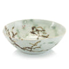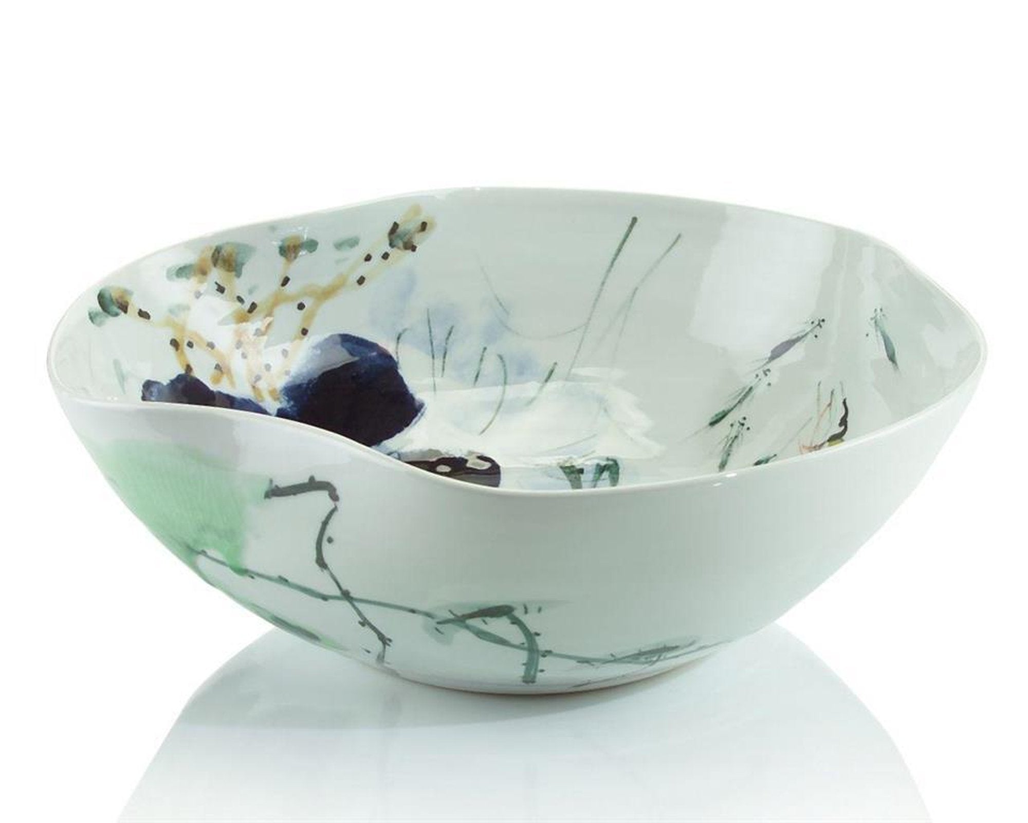 - A curled-rim porcelain bowl is fired with designs in greens and yellows.