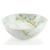 - A curled-rim porcelain bowl is glazed in greens and yellows.