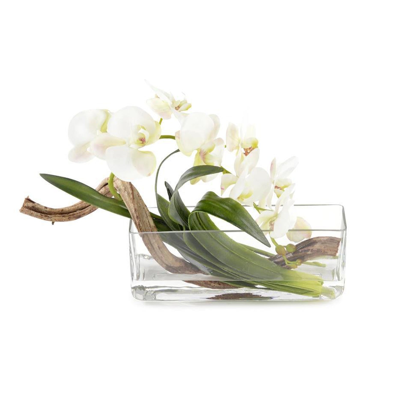 - A rectangular glass vase is filled with a phalaenopsis orchid and natural curly vine in faux water.