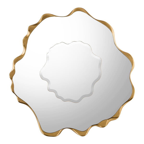 - Made of glass, this mirror is adorned in a Gold Coast finish and showcases an organic silhouette similar to a geode slice