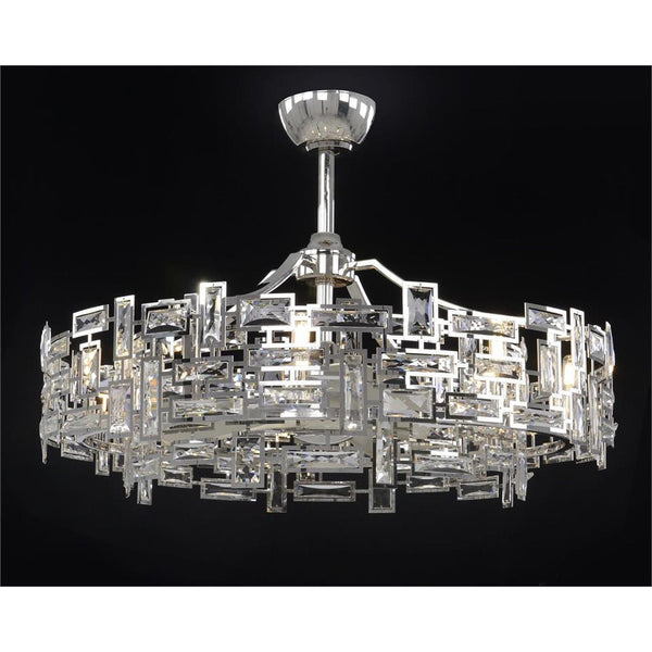 - A contemporary fandelier with two tiers of faceted crystals with eight lights.