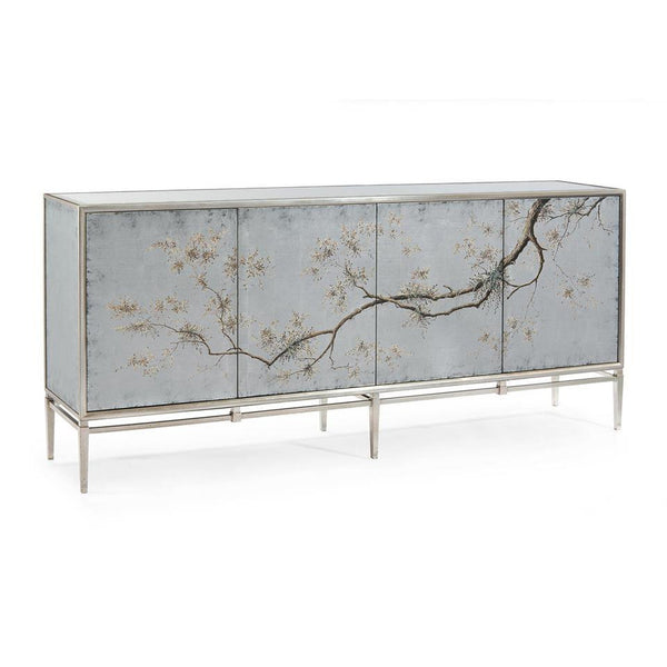 - The four doors of this credenza feature églomisé panels with a reverse-hand-painted branch running across them to make a complete picture.