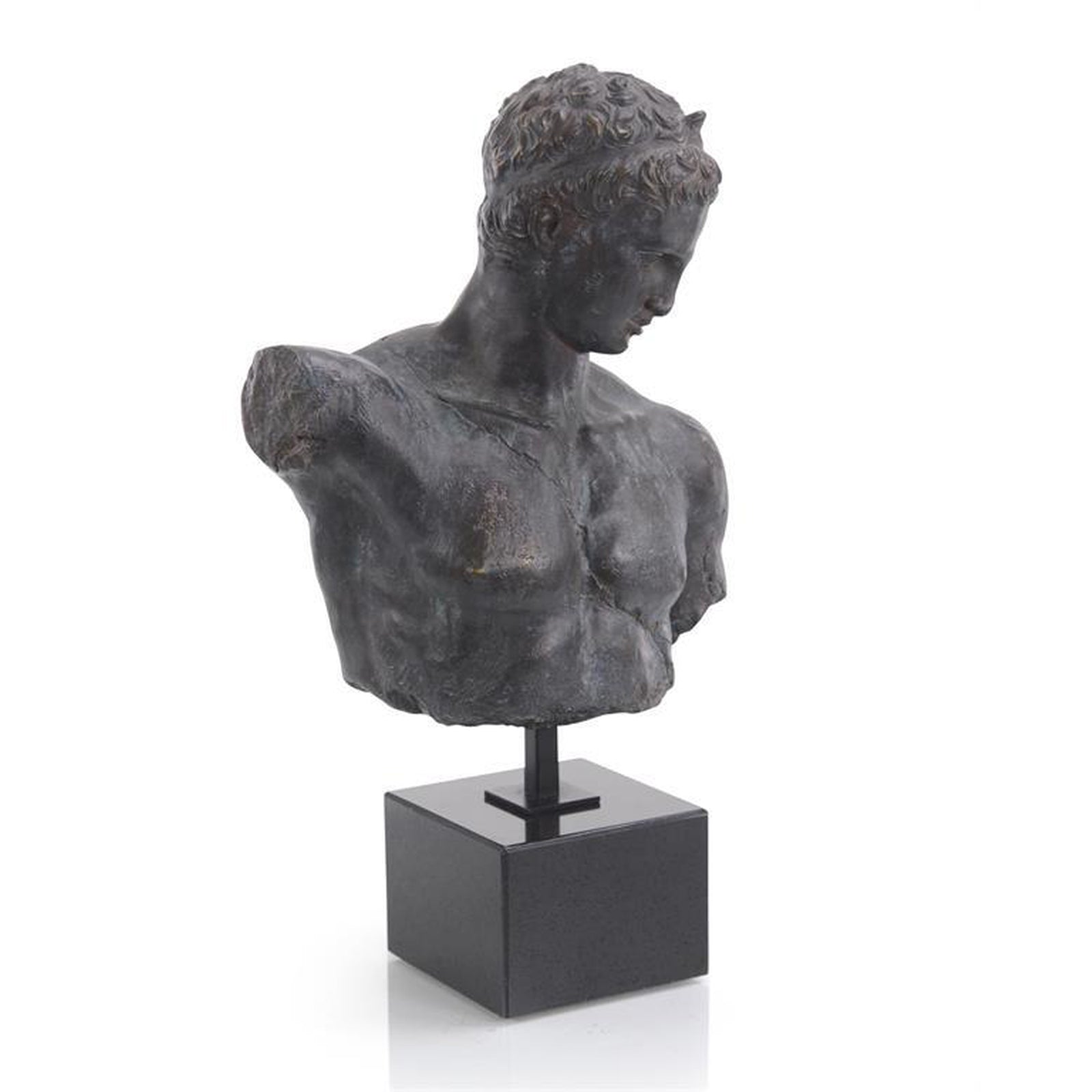 - A Greek bust fragment recreated in a verde-black finish stands on a bronze-finished stand and a black marble base.