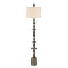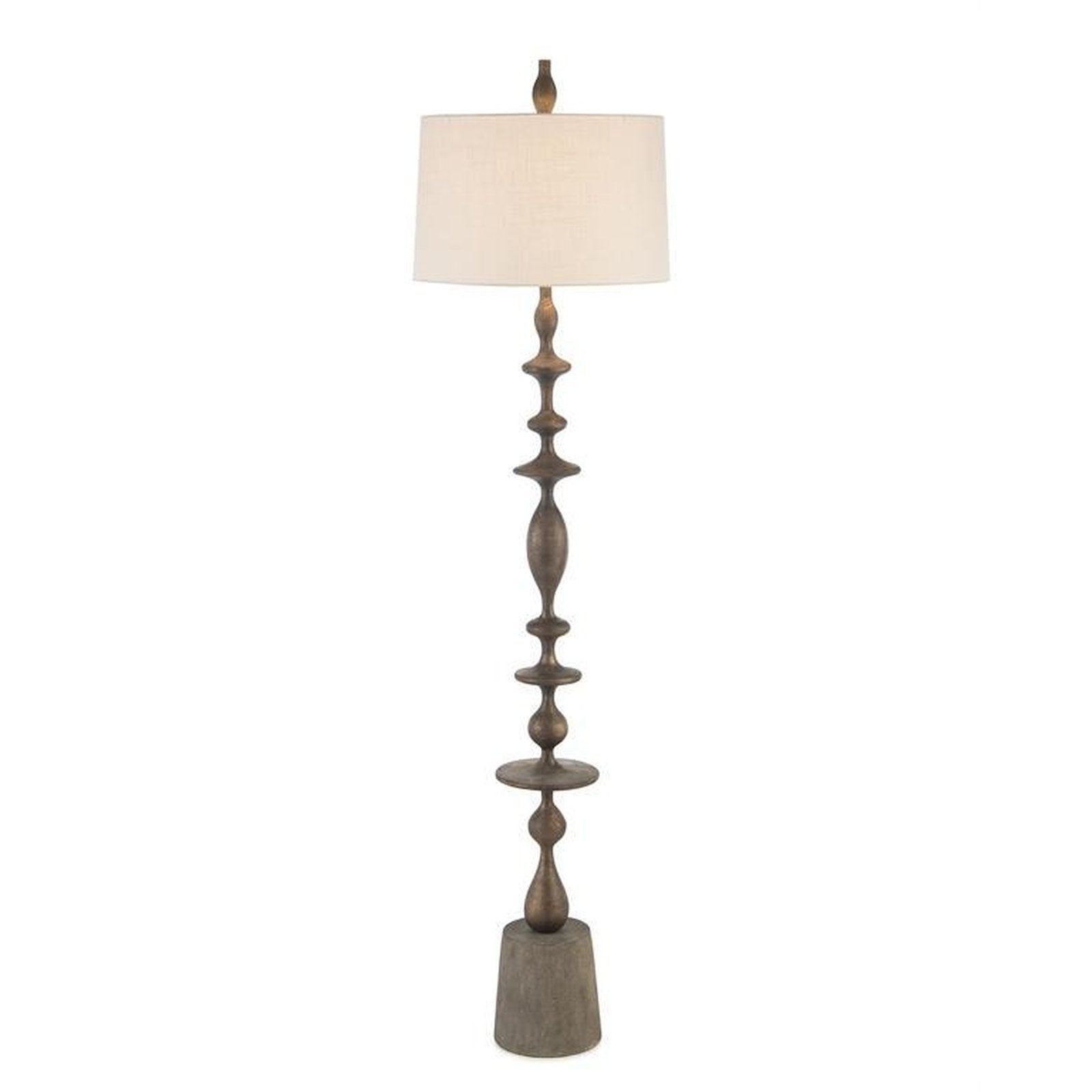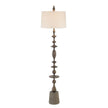- A dramatically carved matte black baluster floor lamp with a concrete base.