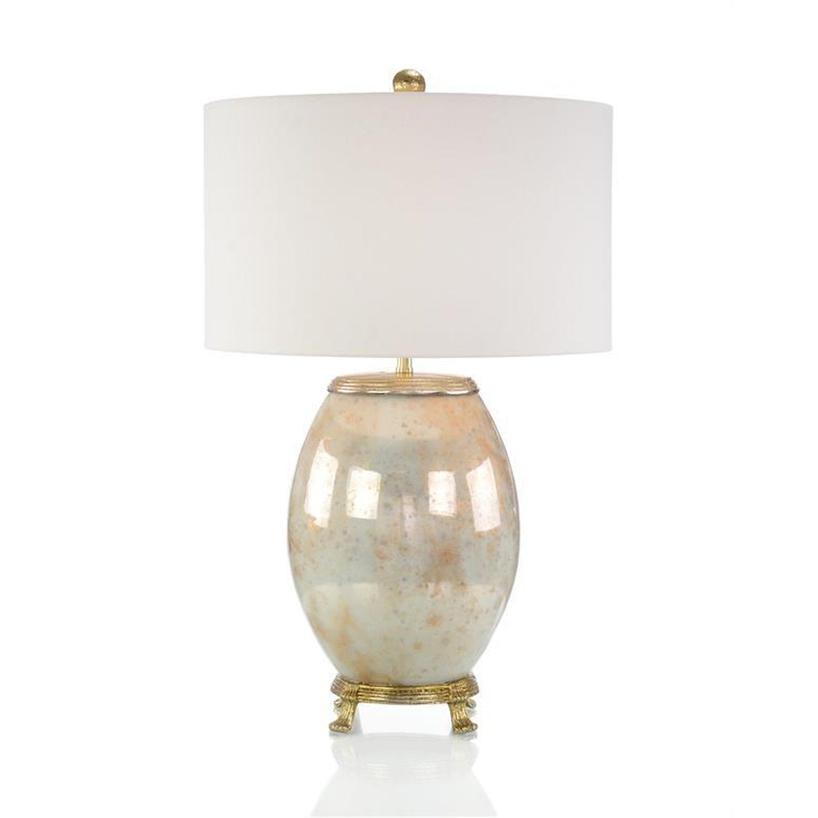 - This classic table lamp is in melded white and cream standing on a lovely footed brass base.