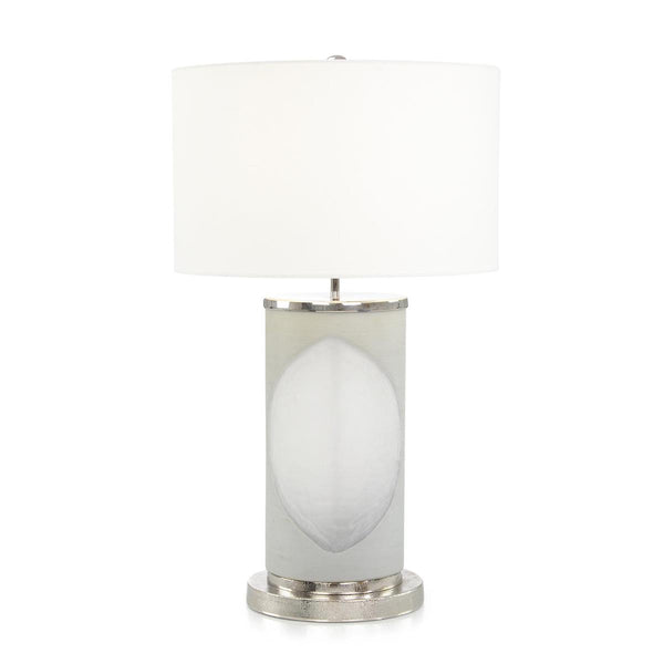 - The ethereal hues of the Oval Grey Table Lamp stem from a cylindrical body of glass adorned with a grey hue, featuring an alluring ovate shape with a frosted look