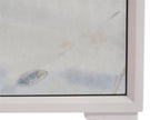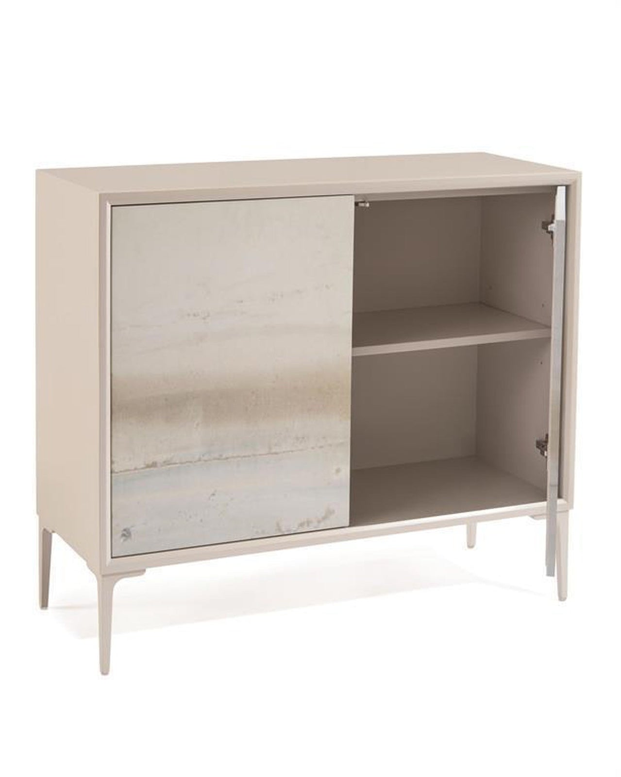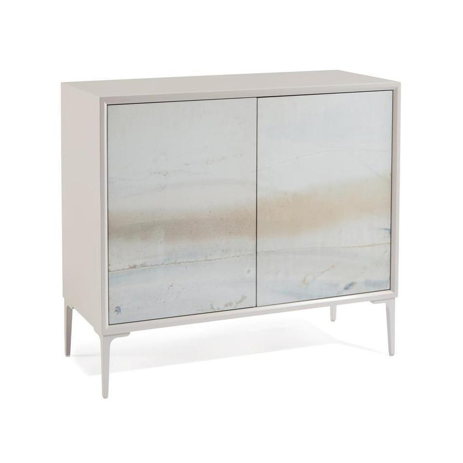 - A two-door cabinet in light grey with a giclée of Soft Blue River by Austin Allen James across the doors, each with push-latch mechanisms.