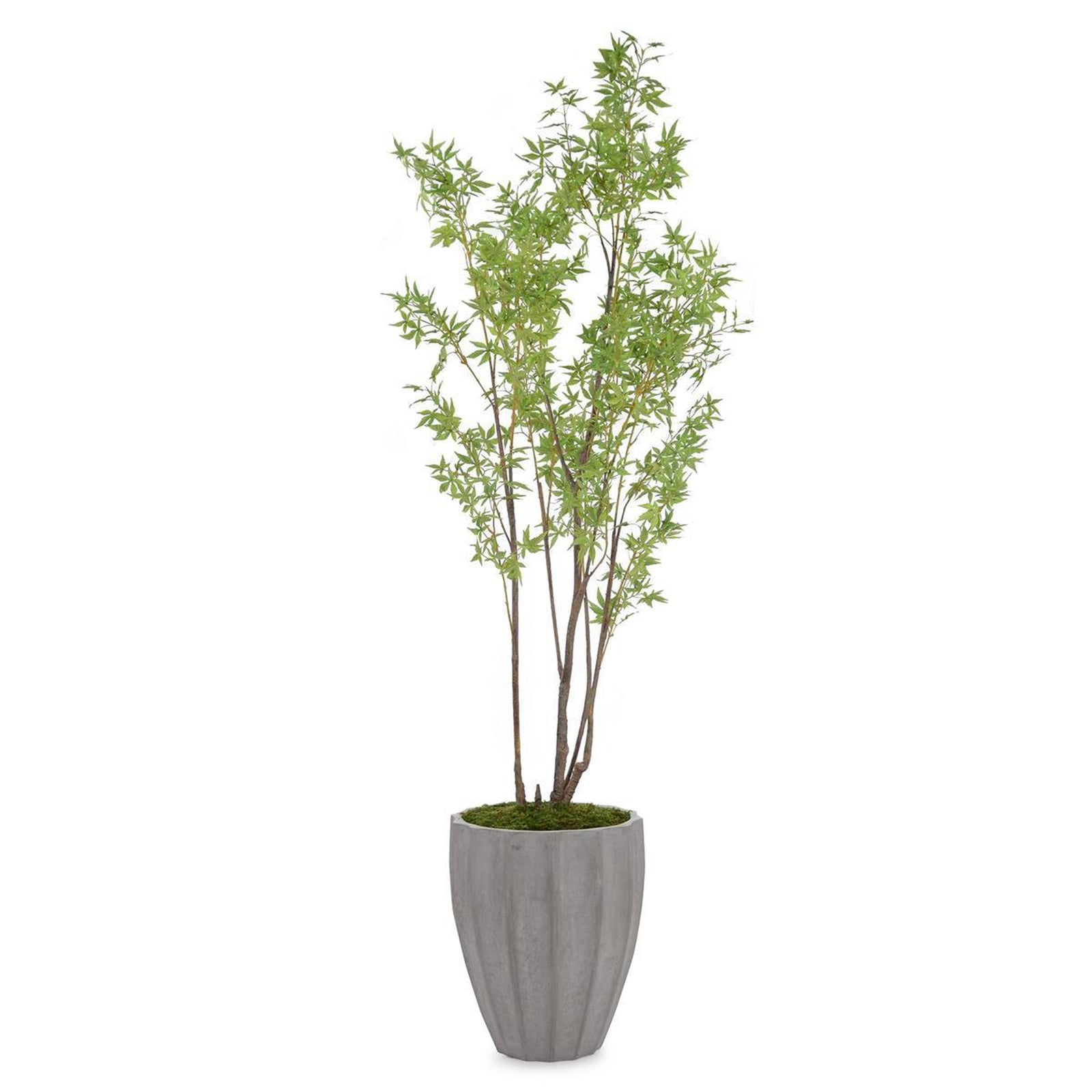 - A natural-looking maple tree and natural preserved mood moss fill a grey, ribbed pot.