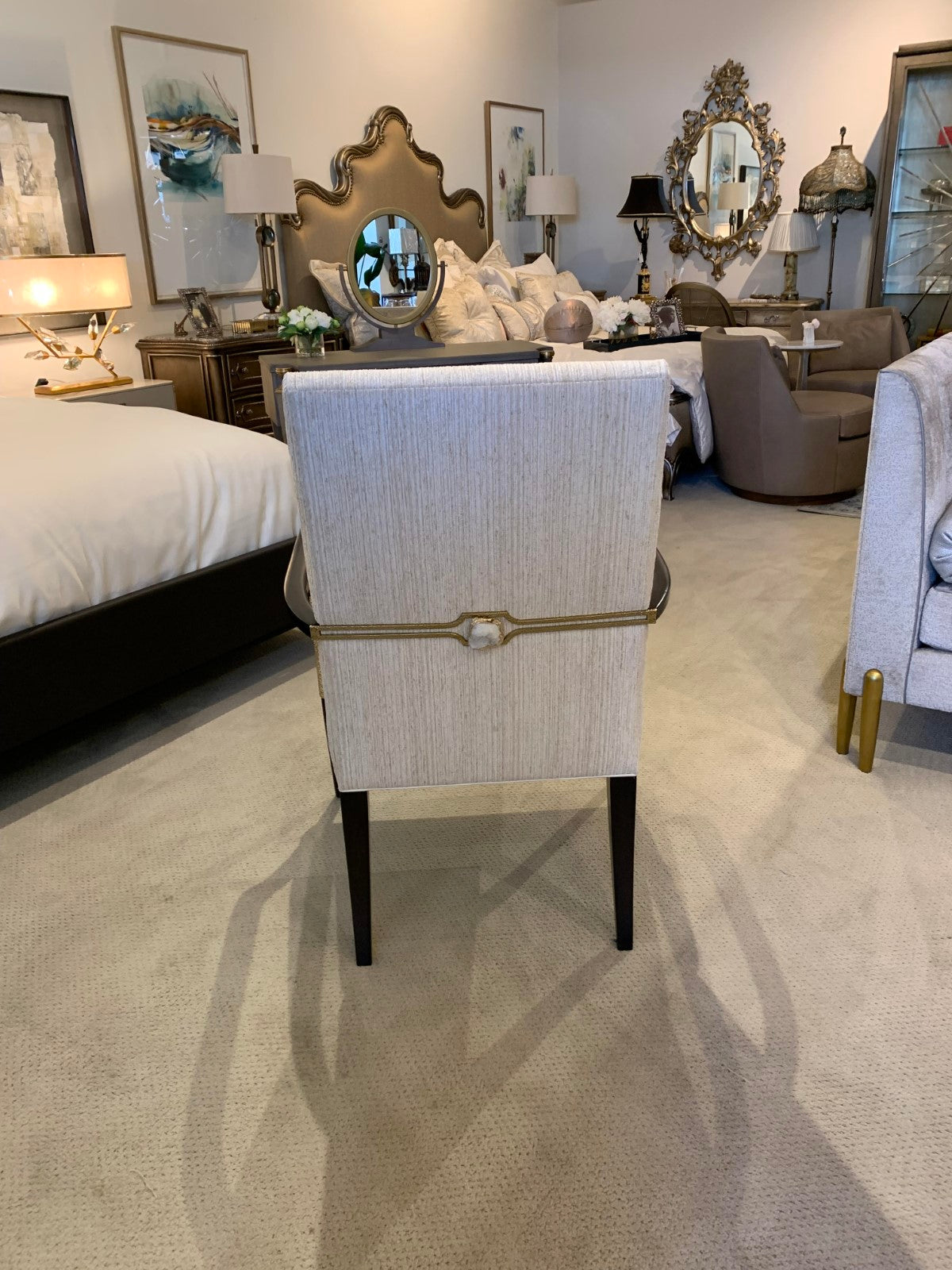 - The upholstered seat and back are in a neutral fabric, with a decorative polished brass band to the rear finished with a white crystal geode.