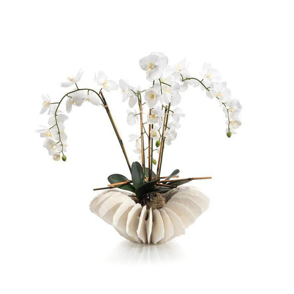 - A translucent ridges bowl with white phalaenopsis orchids supported with natural bamboo and foliage.