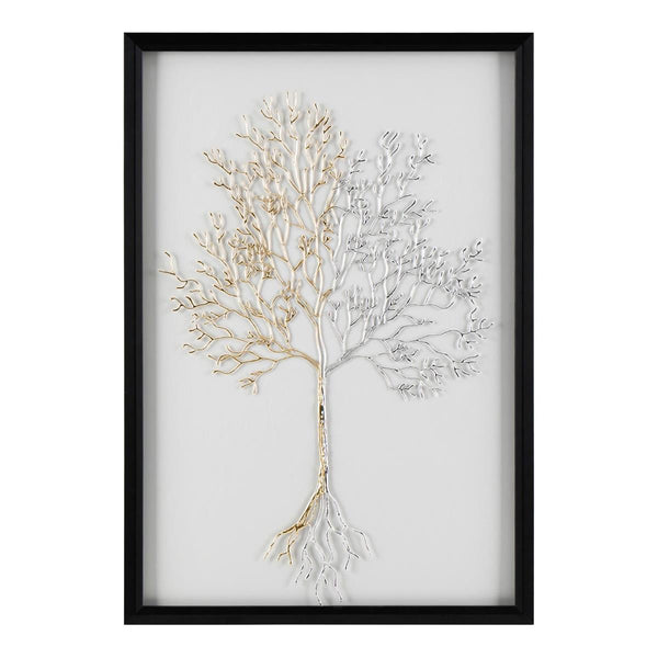 - Seasons depicts an elegant tree with exposed roots on acrylic, showcasing a stunning two-toned look of gold and silver leaf