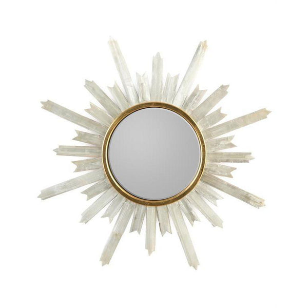 - An impressive selenite starburst radiates from a gold frame and reflects a clear mirror.