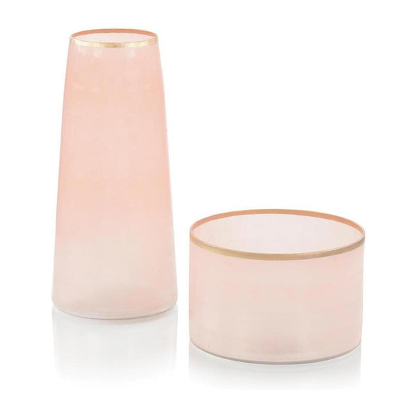 - A pair of palest of pink glass vases, both with a gold rim accent.