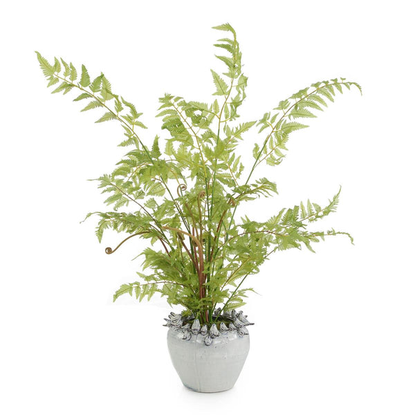 - Pale blue pottery pot with blue birds around the rim of the vase, filled with tall lacy ferns and natural preserved green mood moss.