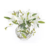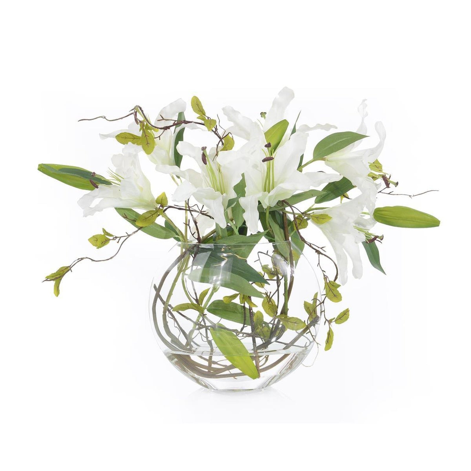 - A clear vase in a moon shape features Casa Blanca lilies in faux water.