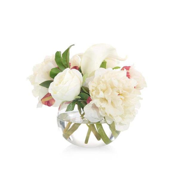 - A clear glass bowl is filled with real-touch peonies, roses, callas, and faux water.