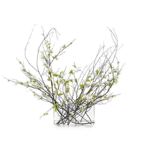 - Natural river birch branches with apple blossoms are in faux water.