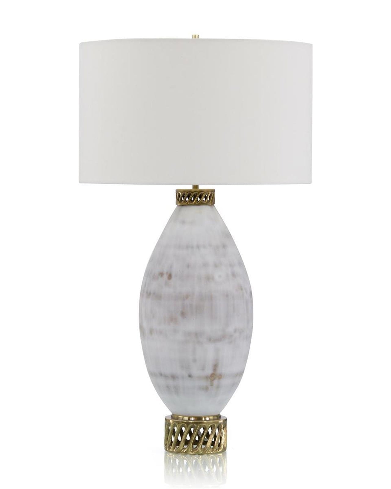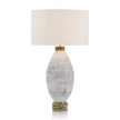 - This glass table lamp features a natural matte finish on a white and cream marbled appearance, accented with a swirling vine cap and base in brass.