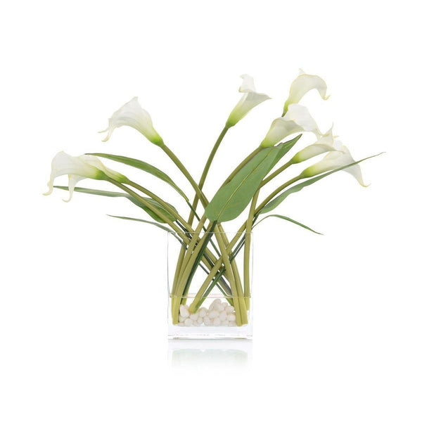 - Windblown Callas are in a clear and slender vase with white rolled marble and faux water.