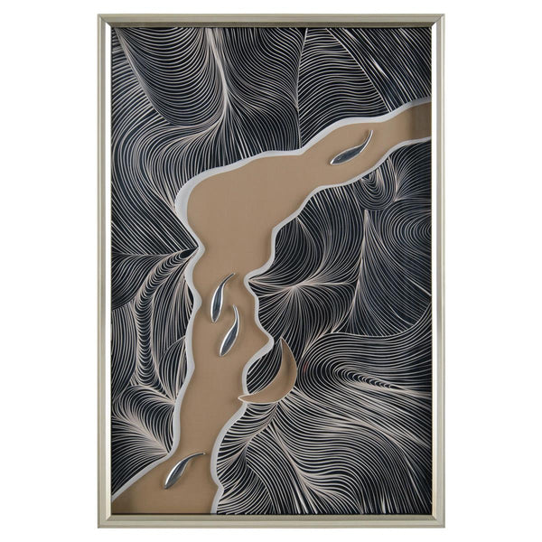 - A winding river in a dark gold hue houses four metallic fish silhouettes in a silver finish, complementing the silver pine wood frame that gently wraps around the piece