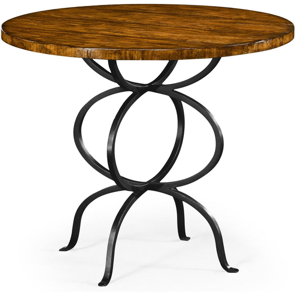 - Wrought iron and country walnut topped circular centre table in the style of French bistro tables of the early 20th century.