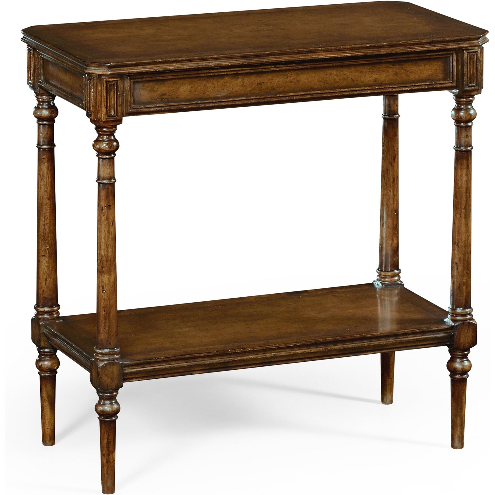 - Restrained design side table in distressed walnut, the canted rectangular top set between tapering baluster legs and an undertier beneath.