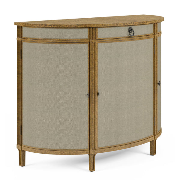 - A solid case with Kravet Linen fabric cabinet doors and understated hardware is capped with a single drawer under a Grey Fruitwood top.