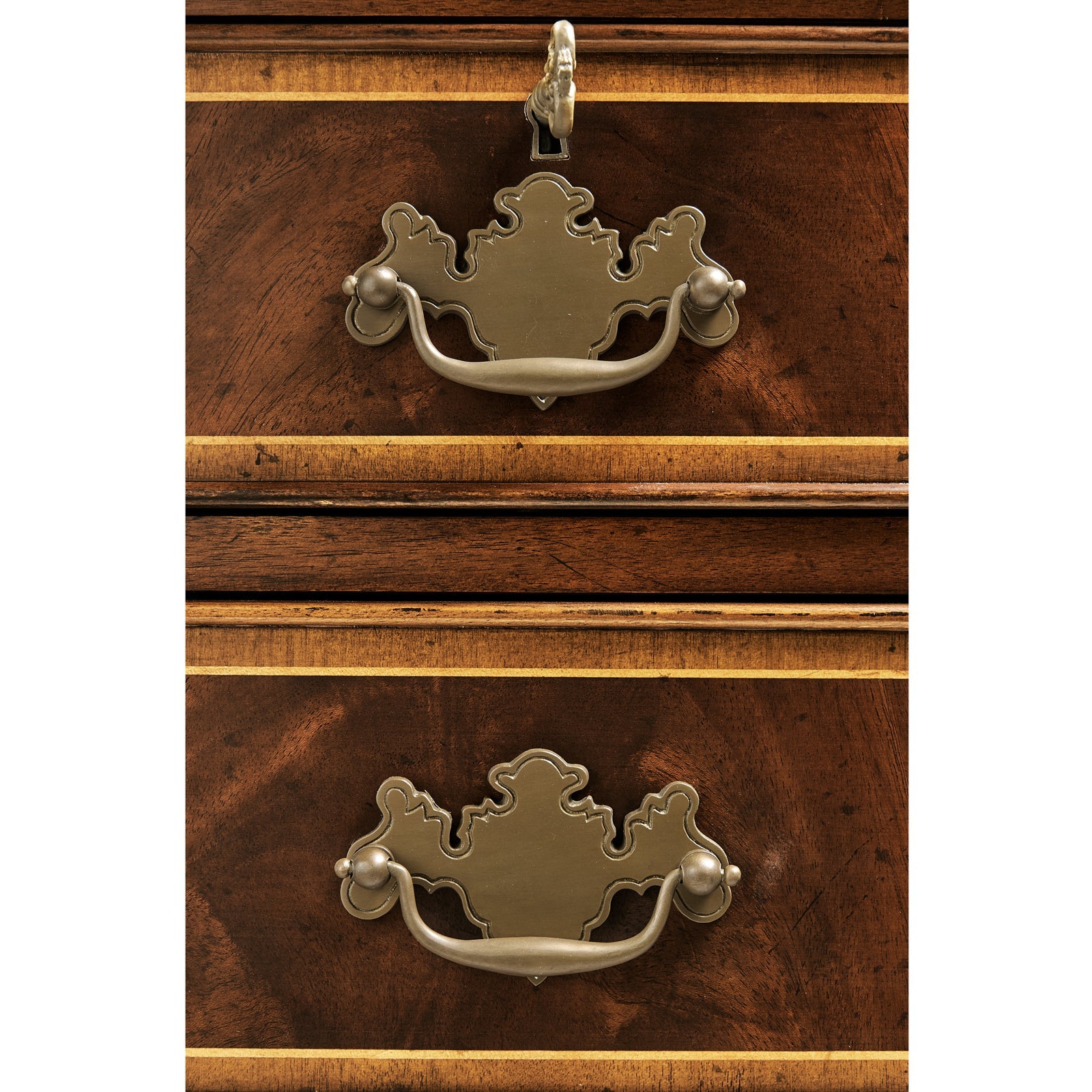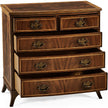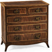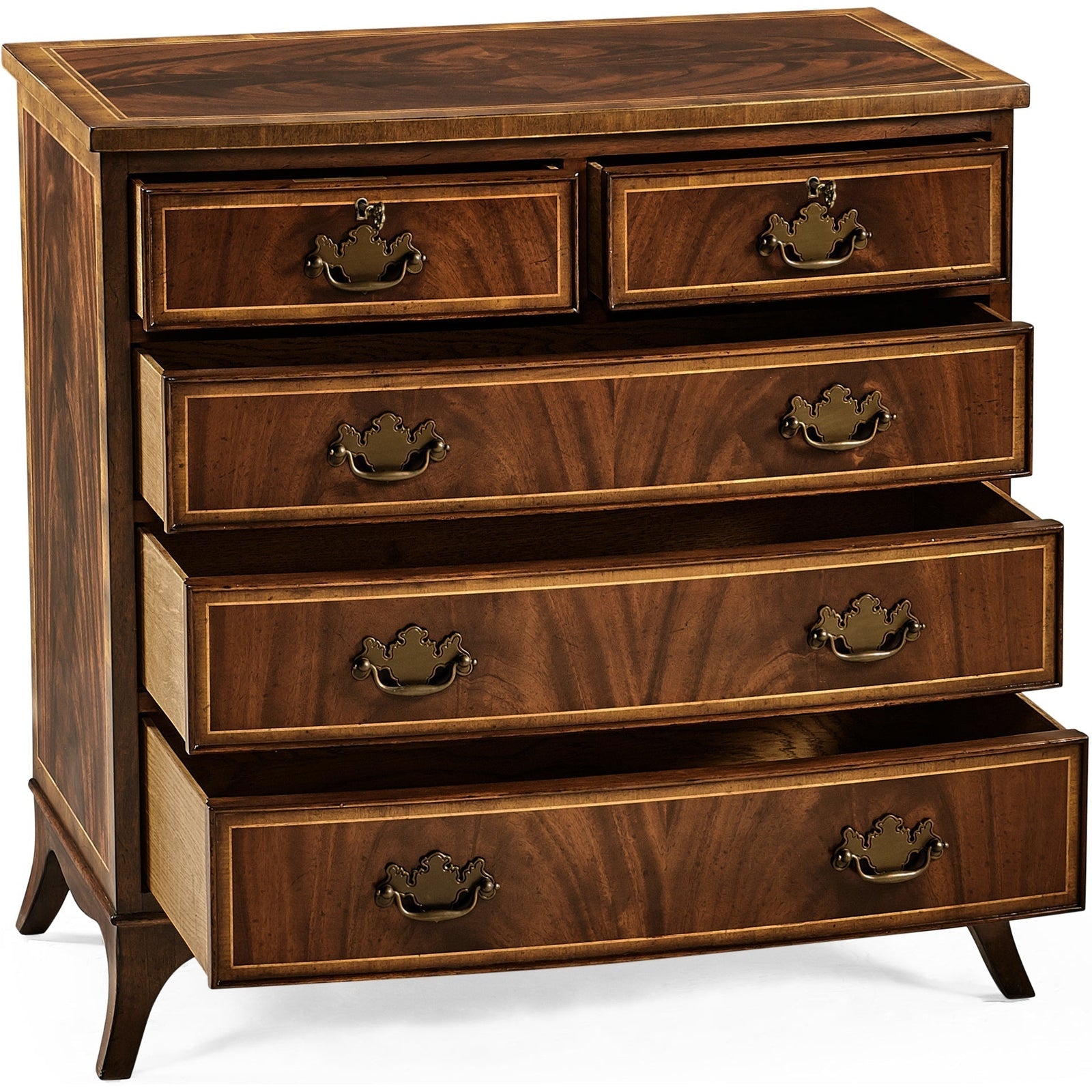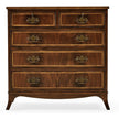 - Classic Regency style mahogany and crossbanded small chest of drawers ideal as a bedside chest, with light antique distress on the two short and three graduated long drawers.